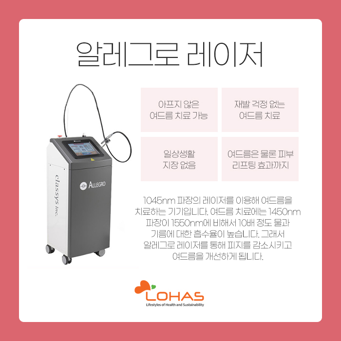이러한 알레그로 레이저는 아프지 않게 여드름을 치료하는데 도움을 받을 수 있을뿐더러 여드름이 다시 재발하지 않을까 걱정하지 않으셔도 된답니다. 또한 일상생활을 하는데 지장을 주지 않는 것은 물론 피부를 리프팅 시키는 데도 도움받을 수 있습니다.