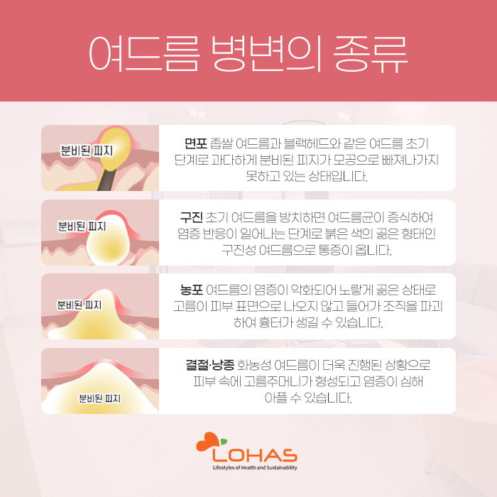 그리고 여드름의 병변은 면포, 구진, 농포, 결절 및 낭종으로 구분되는데요. 면포는 여드름 초기 단계인데, 피지가 과다하게 분비되어 모공으로 빠져나가지 못하고 있는 상태랍니다. 구진은 초기 여드름을 방치할 경우 여드름균이 증식하게 되면서 염증 반응이 일어나게 되는 단계입니다. 붉은색의 곪은 형태이며 통증이 있습니다.